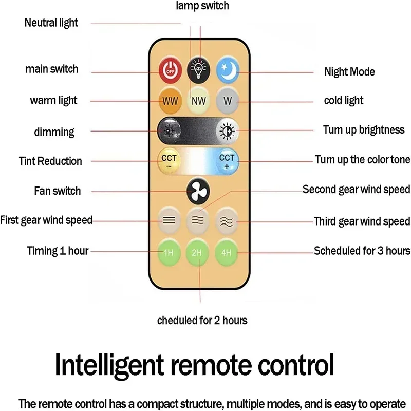 Remote Control: Adjust 3 light sources, brightness, 3 speed wind, and timing function.